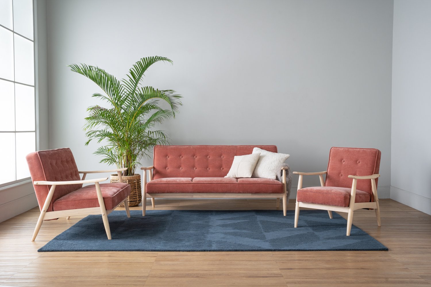 Baja 2 seater sofa with White Wash colour frame, Salmon colour Baxmal fabric