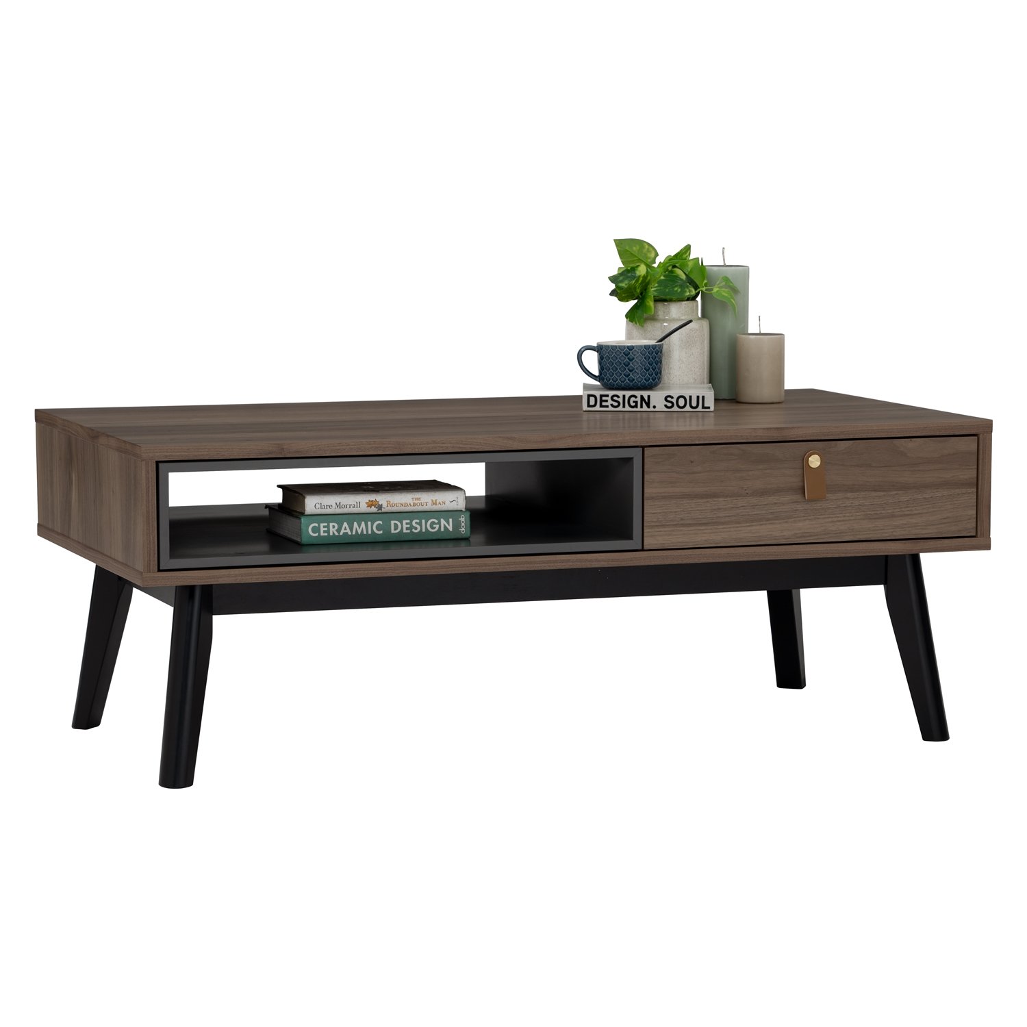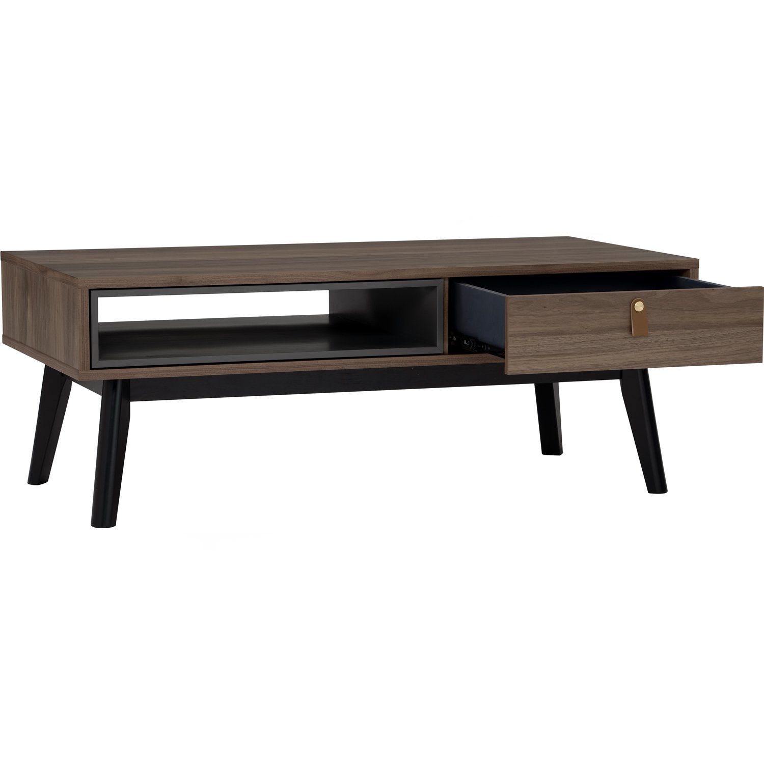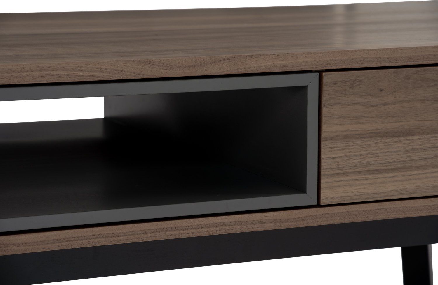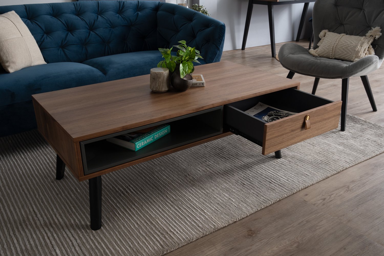 Castor Coffee Table in Walnut veneer top, Gunmetal Grey colour drawer with Black colour leg