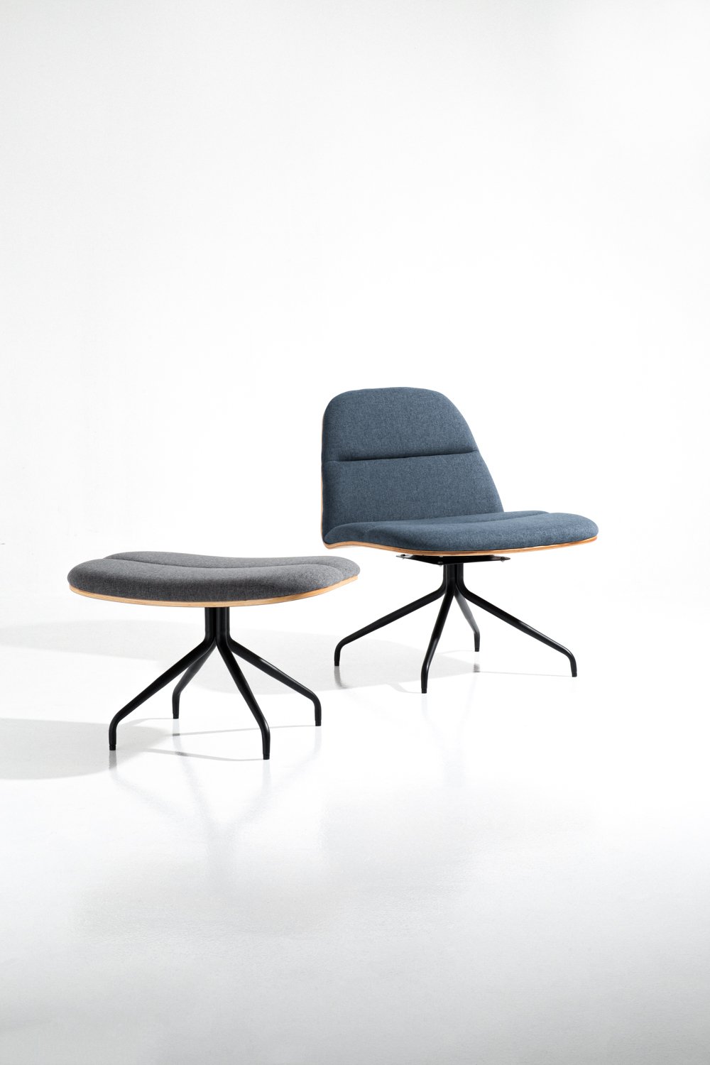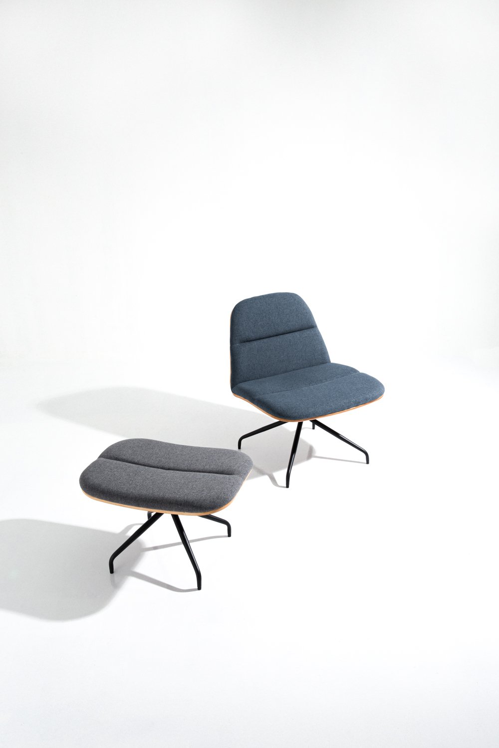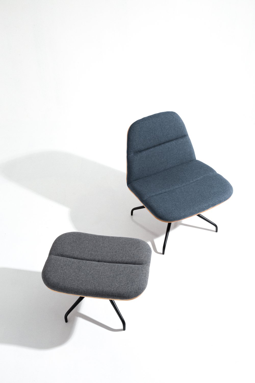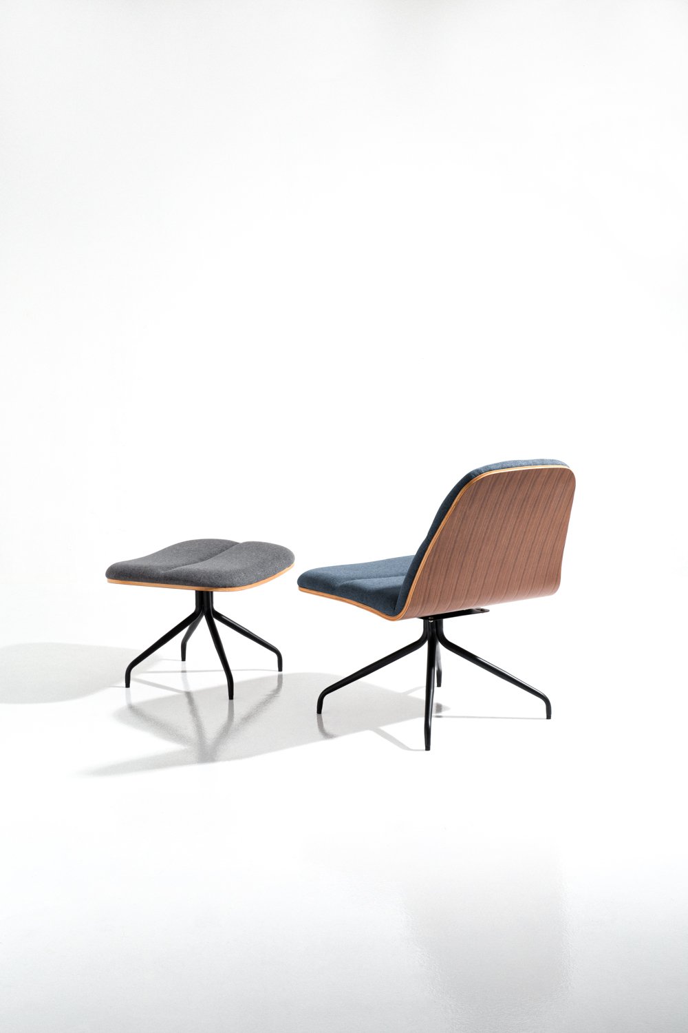 Crown lounge chair with Matt Black Epoxy leg, Walnut veneer backrest and seat with Twilight colour in Dimity fabric