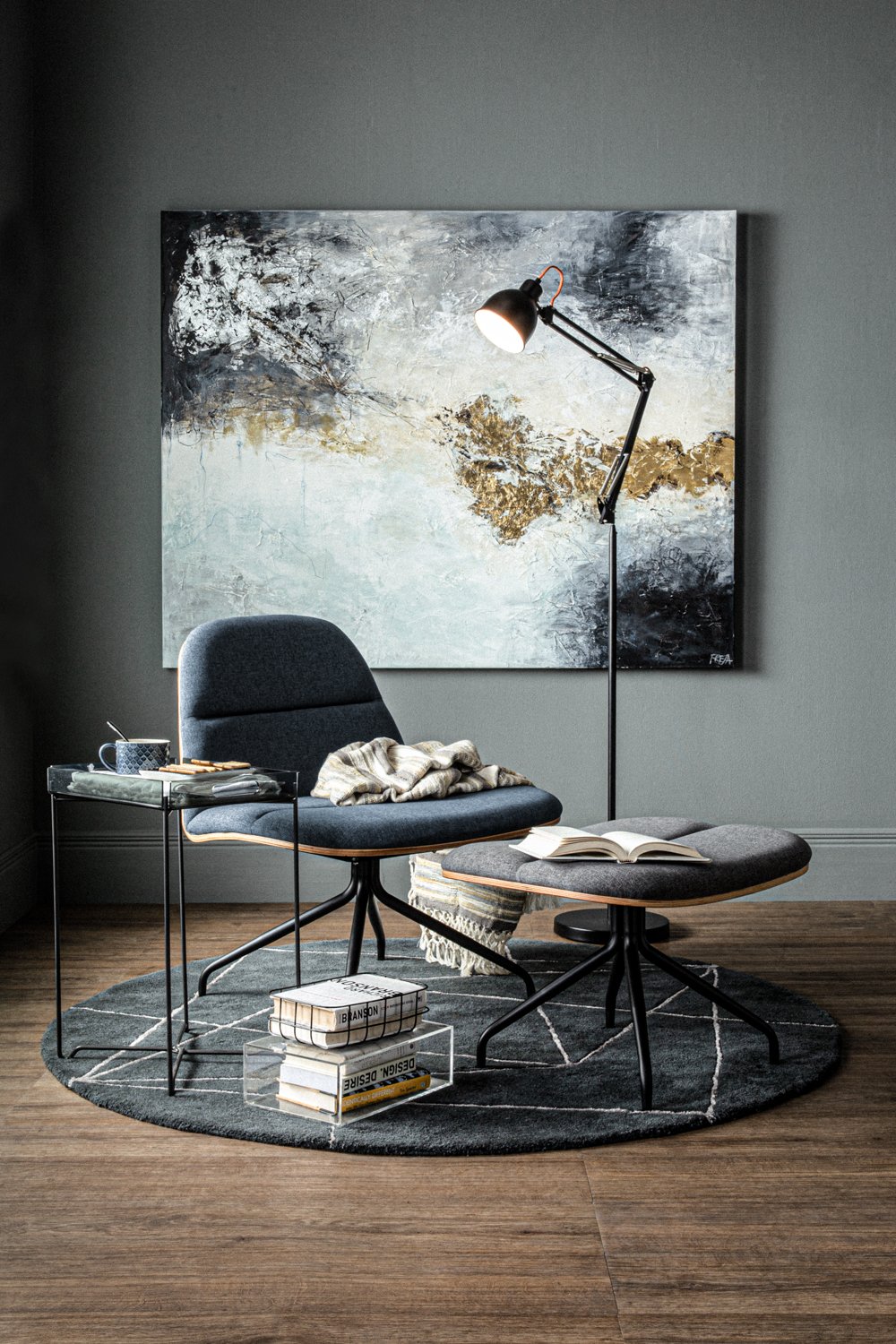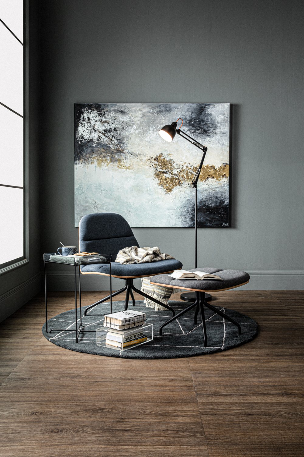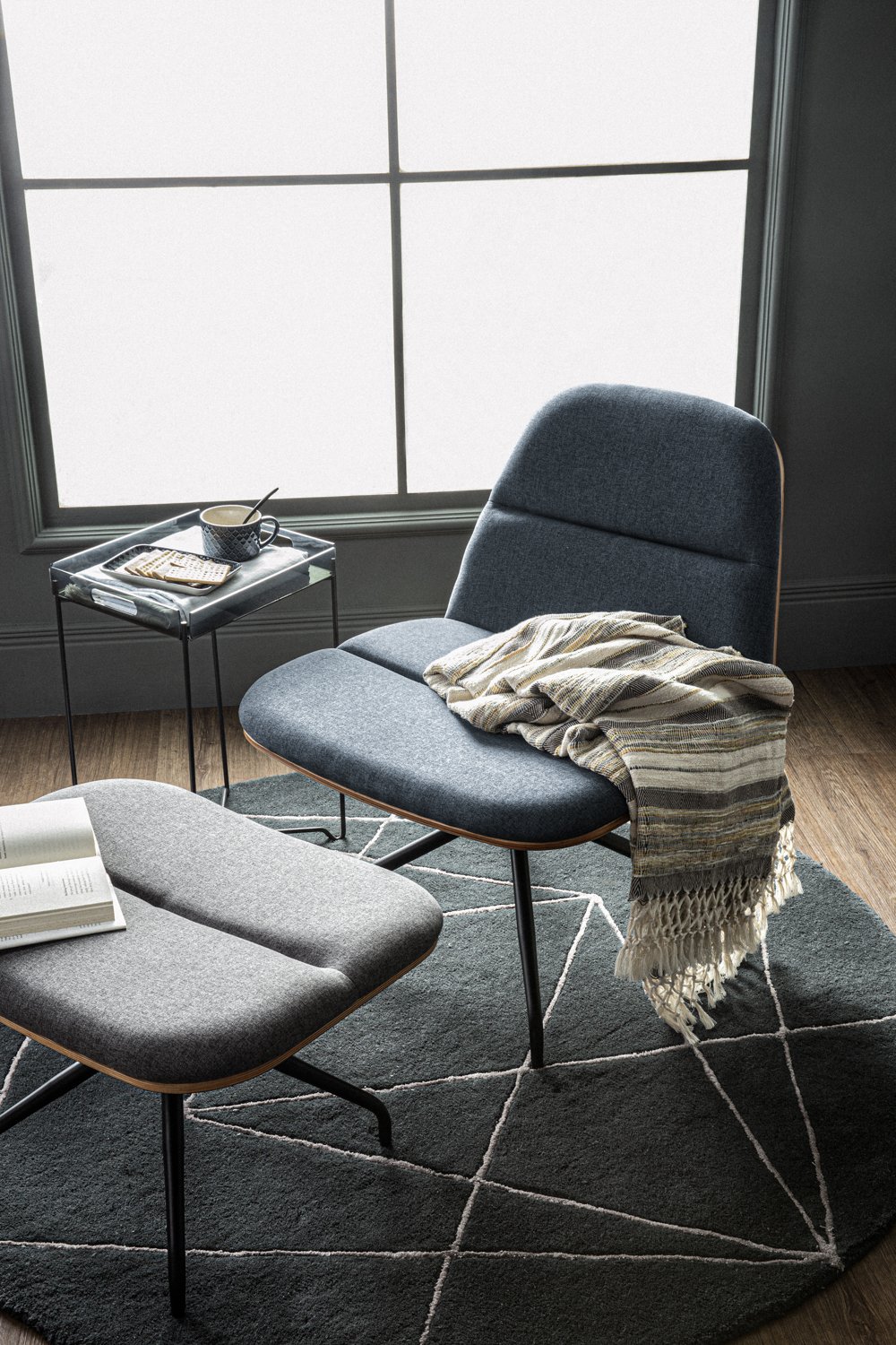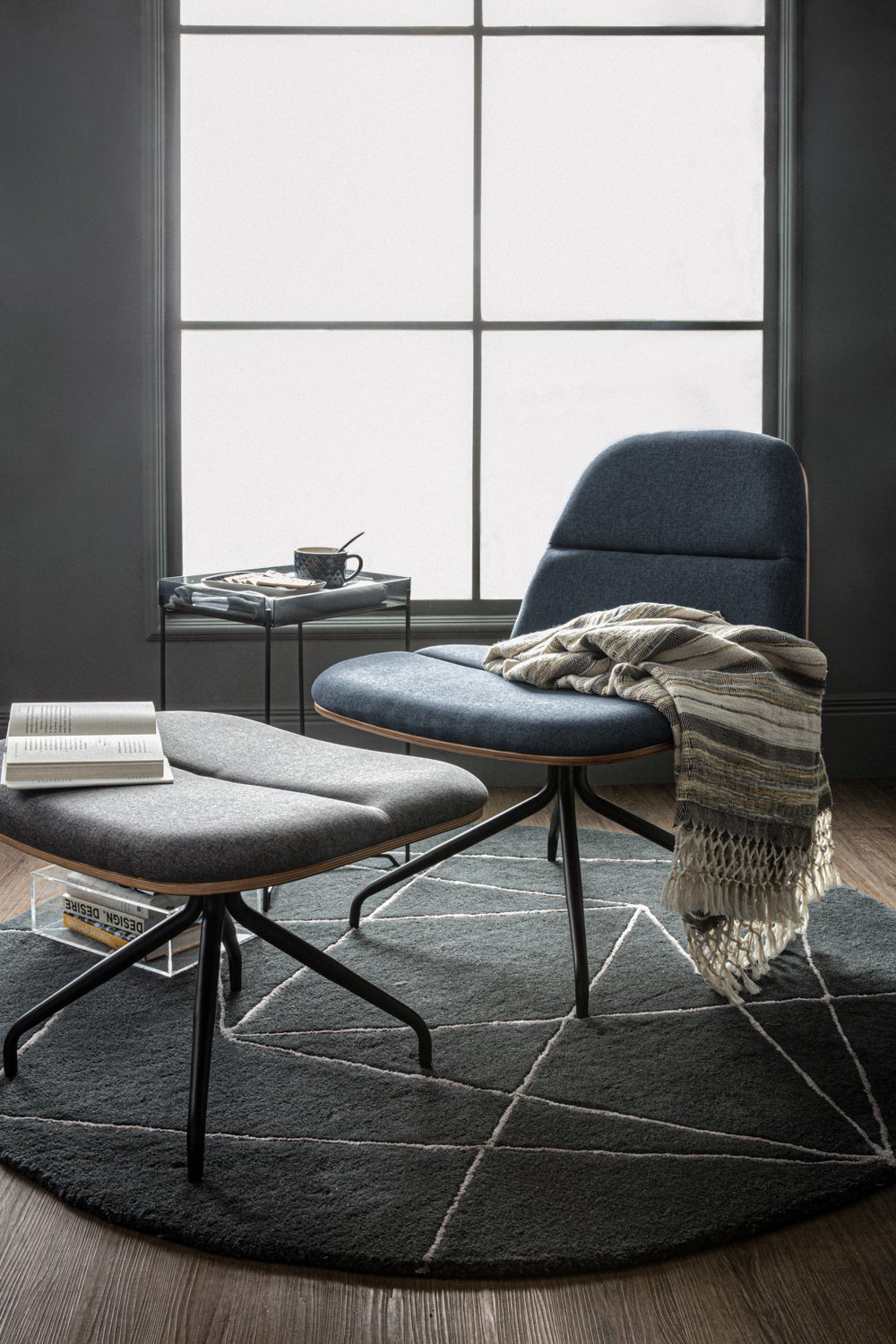 Crown lounge chair with Matt Black Epoxy leg, Walnut veneer backrest and seat with Twilight colour in Dimity fabric