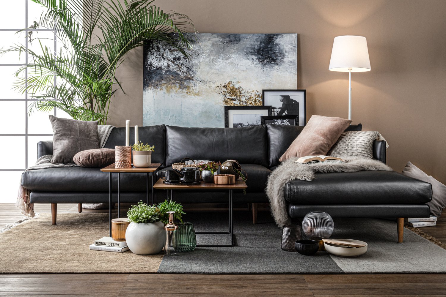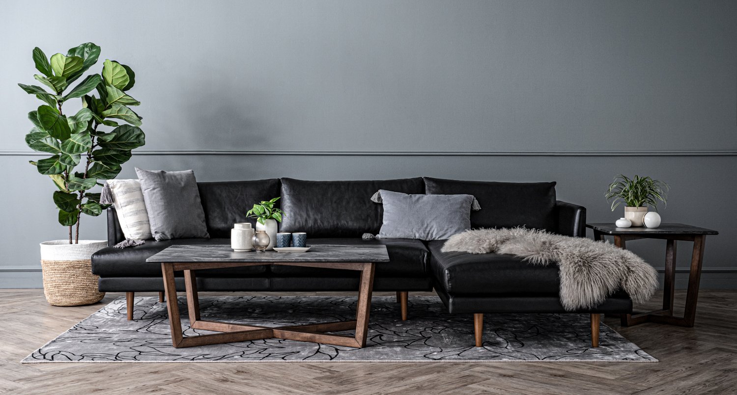 Duster 3 seater sofa with left chaise with Walnut colour leg, Onyx colour in Aniline Leather