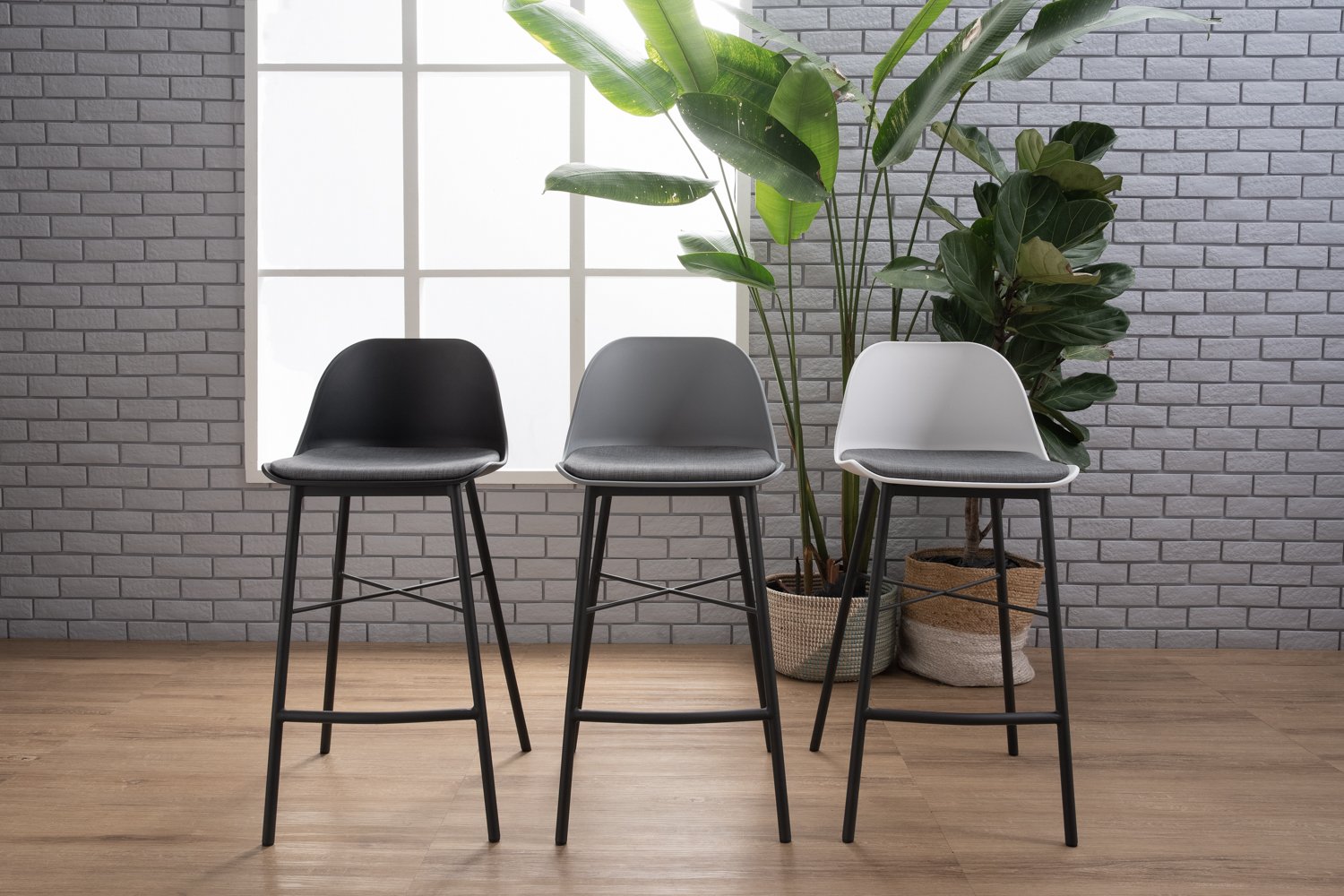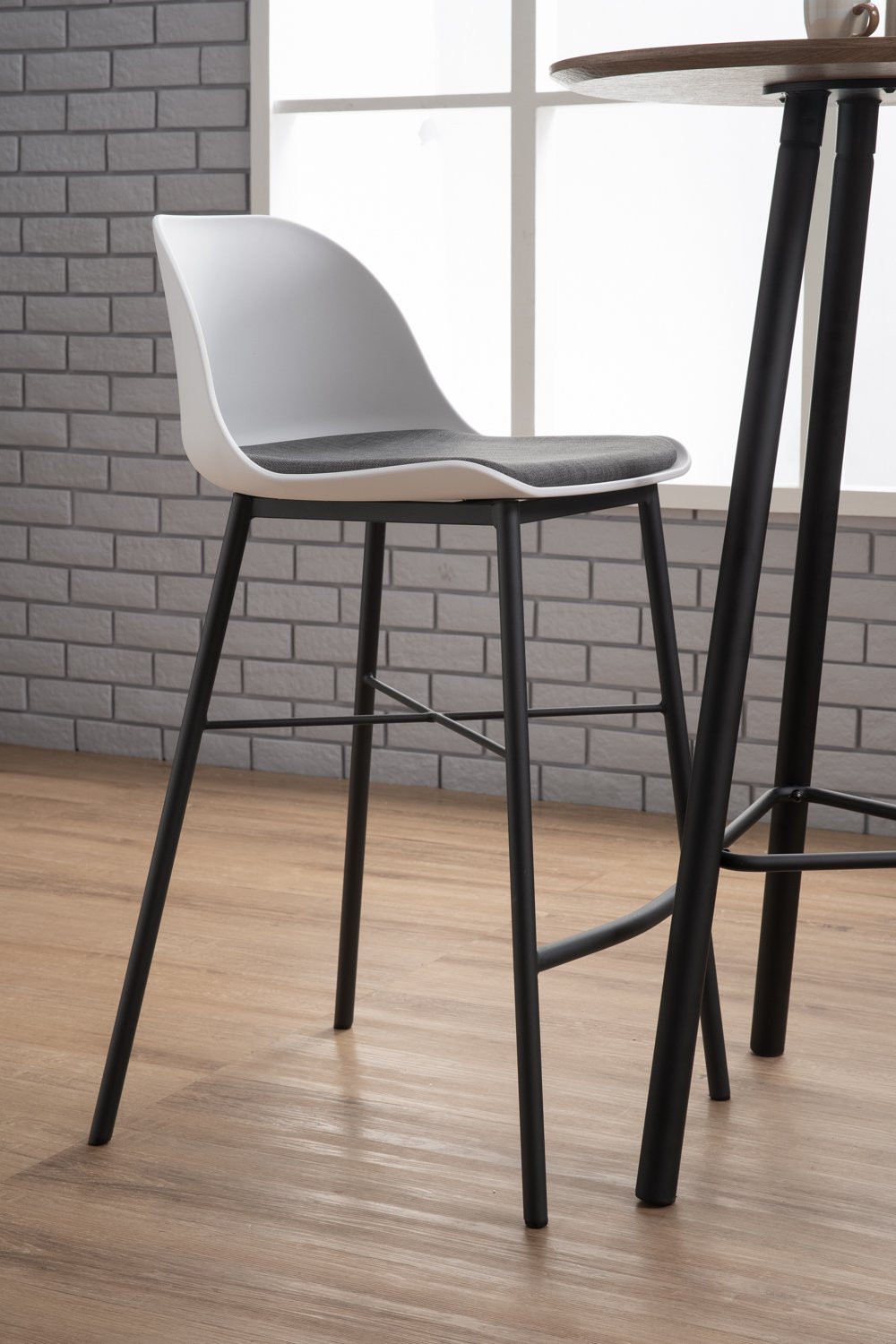 Laxmi counter chair in Matt Black Epoxy leg, White colour seat and Battleship Grey colour cushion