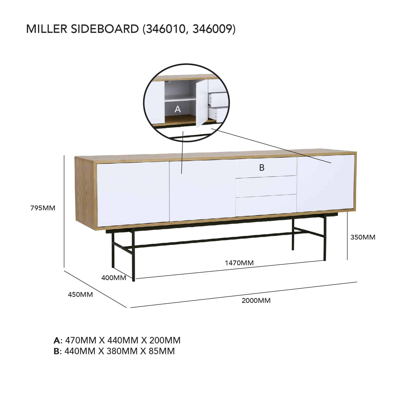 Miller 2.0M Sideboard in Oak veneer body, White colour door with Matt Black Epoxy colour leg