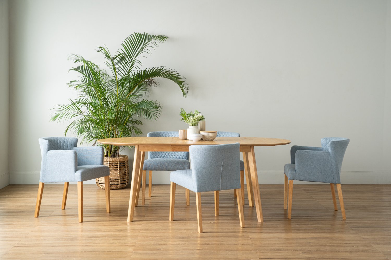 Rhoda 1.1m bench chair with Natural colour leg, Light Blue colour Double fabric seat & back