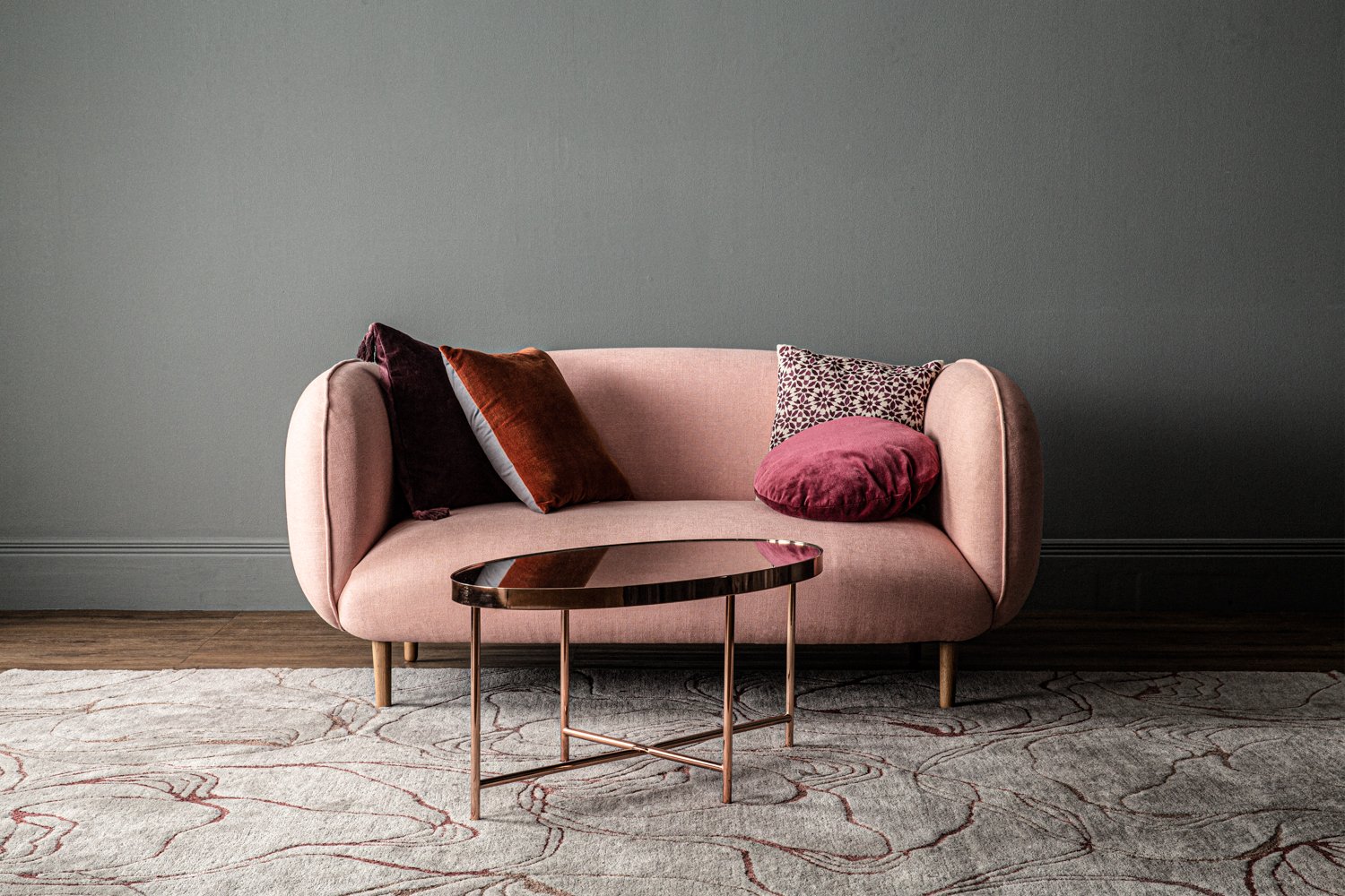 Skoda Sofa with Oak leg, Tangerine colour Crepon fabric