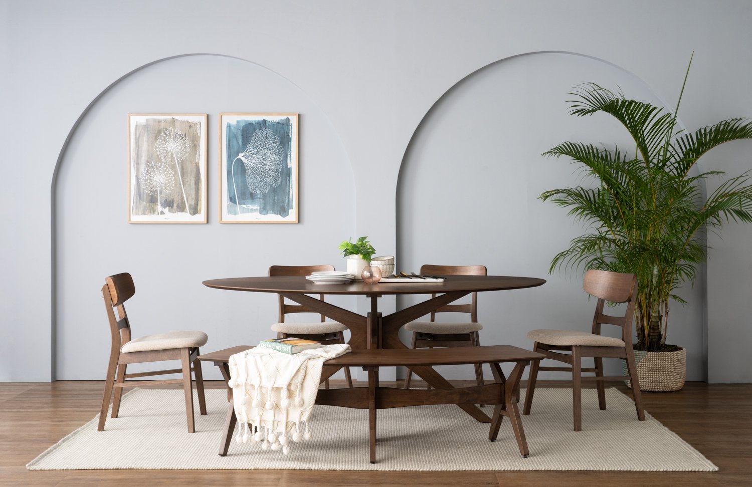 Tara Dining Chair with Cocoa colour leg, Walnut veneer chair back and Beige colour Bruta fabric